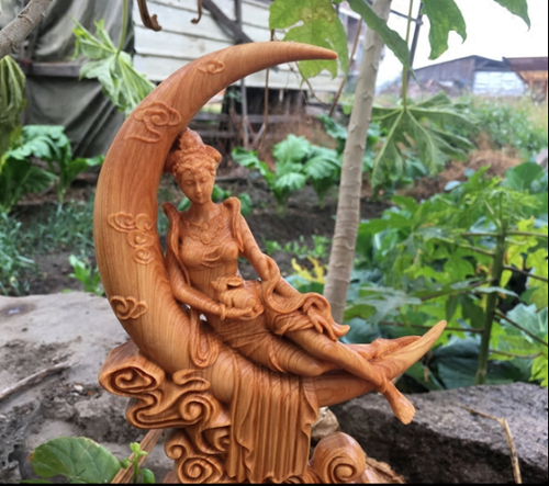9 Chinese Natural Boxwood Carving Moon Goddess Chang E Rabbit