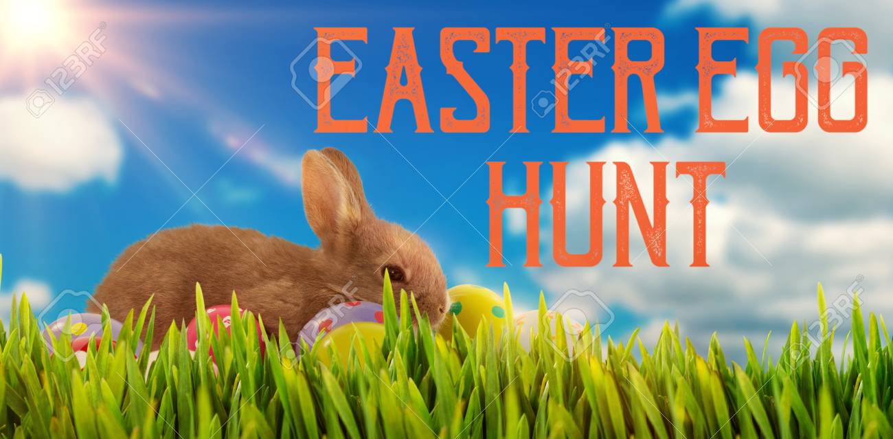 Brown Bunny With Colorful Easter Egg Against Close Up Of Grass