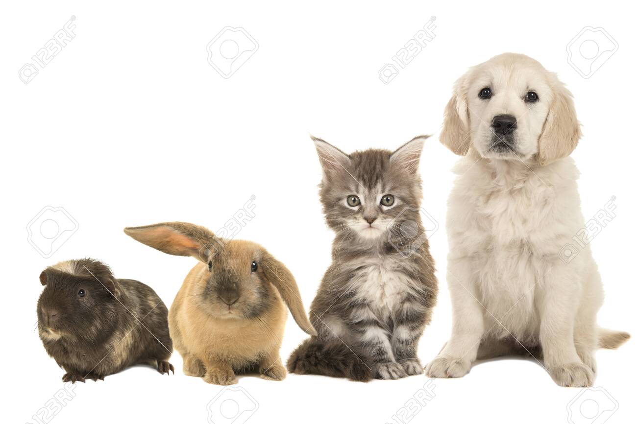 Group Of Different Pets A Puppy Kitten Rabbit And A Guinea
